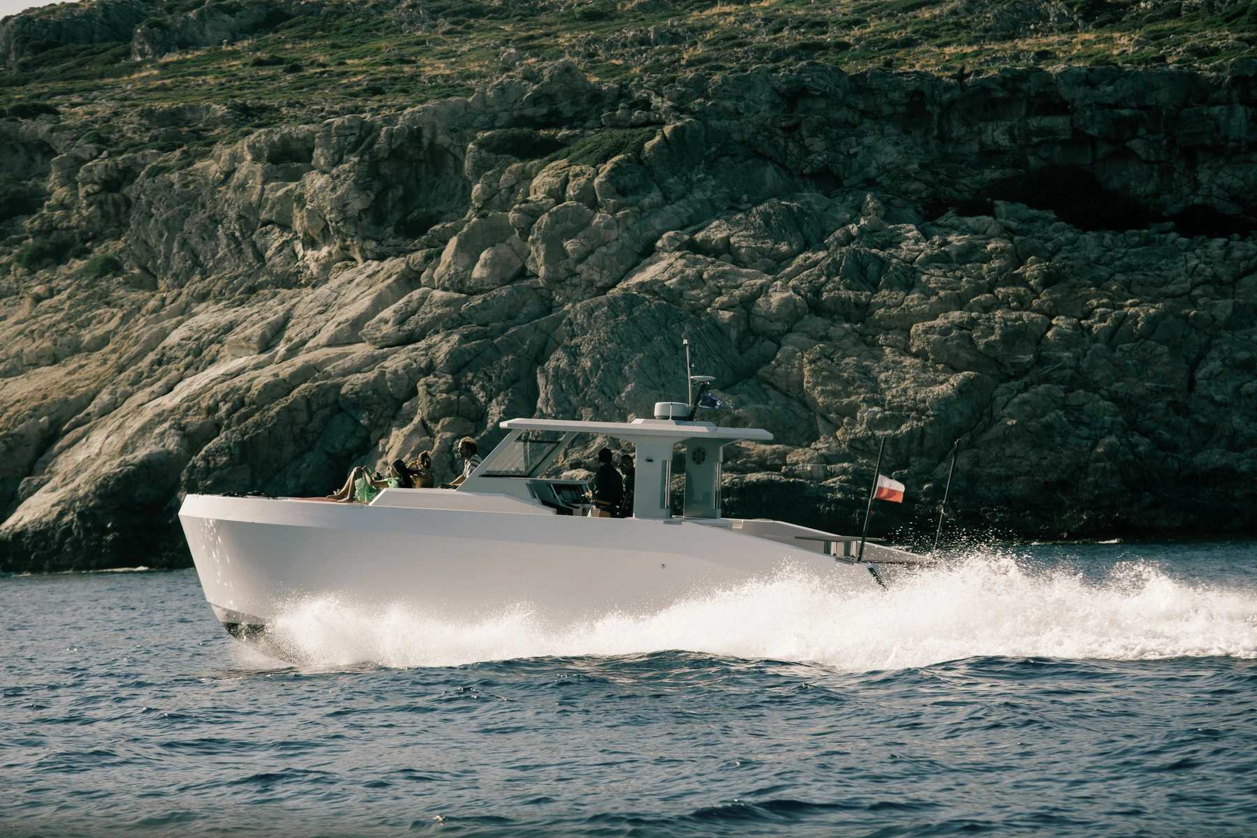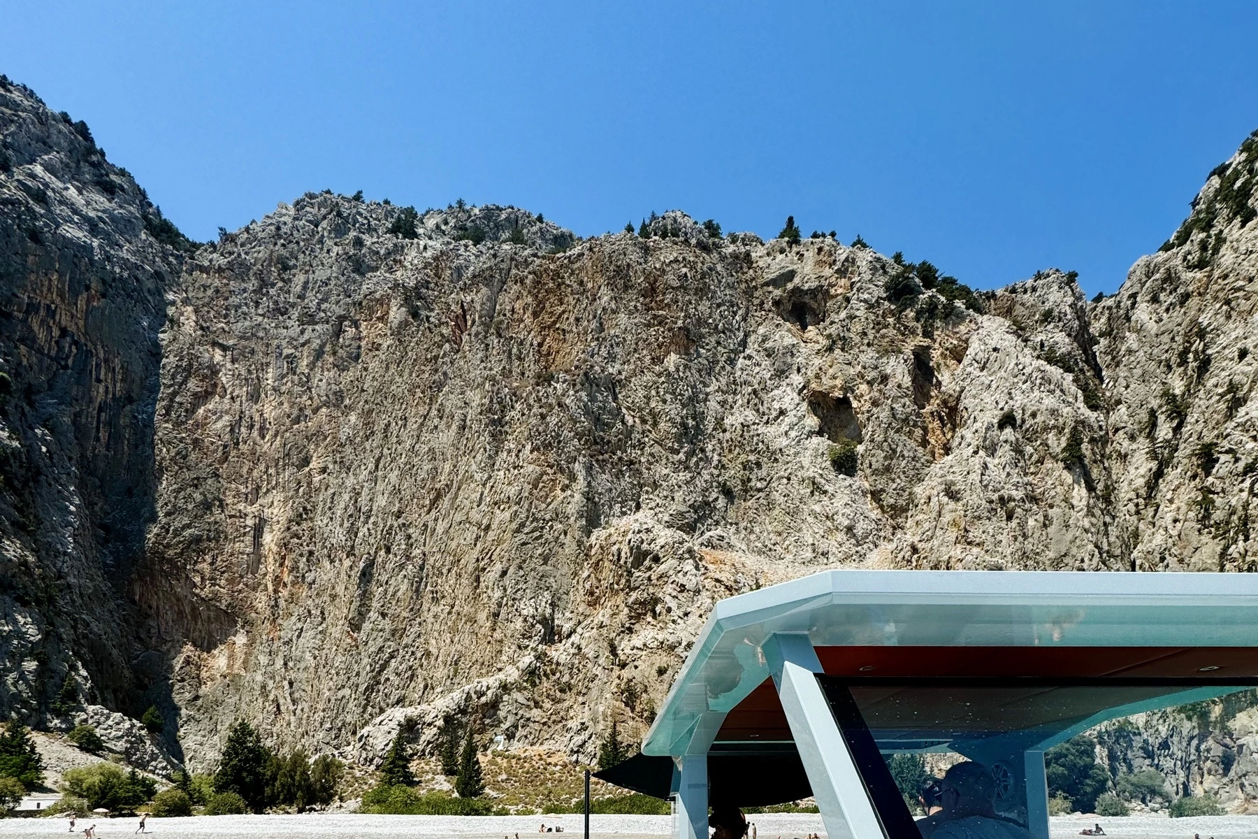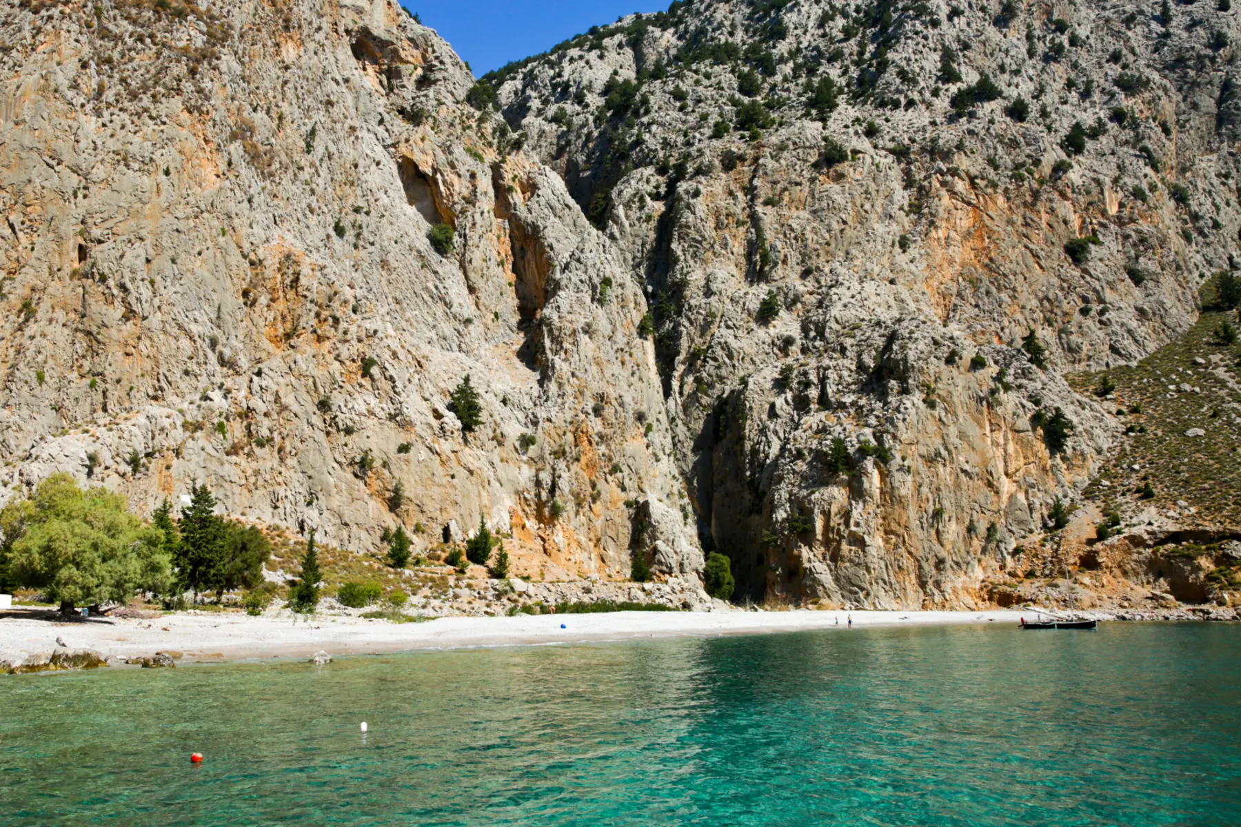 The initial view is transcendent: crystal-clear blue water laps at a silent pebbled shore, while a sheer cliff nearly 300 m high soars skyward just beyond. This vertical rock face—appearing as if sliced by a titan’s hand—creates a dramatic natural amphitheater, even casting cool afternoon shadows over the cove. Perched on the cliff’s edge is a tiny white chapel of Saint George, a humble guardian of the bay that whispers of the sacred in this wild place. The exclusivity of arriving by private yacht heightens the sense of discovery; amid such cinematic grandeur, one feels the awe of a Greek odyssey unfolding in real time, utterly removed from the everyday.
